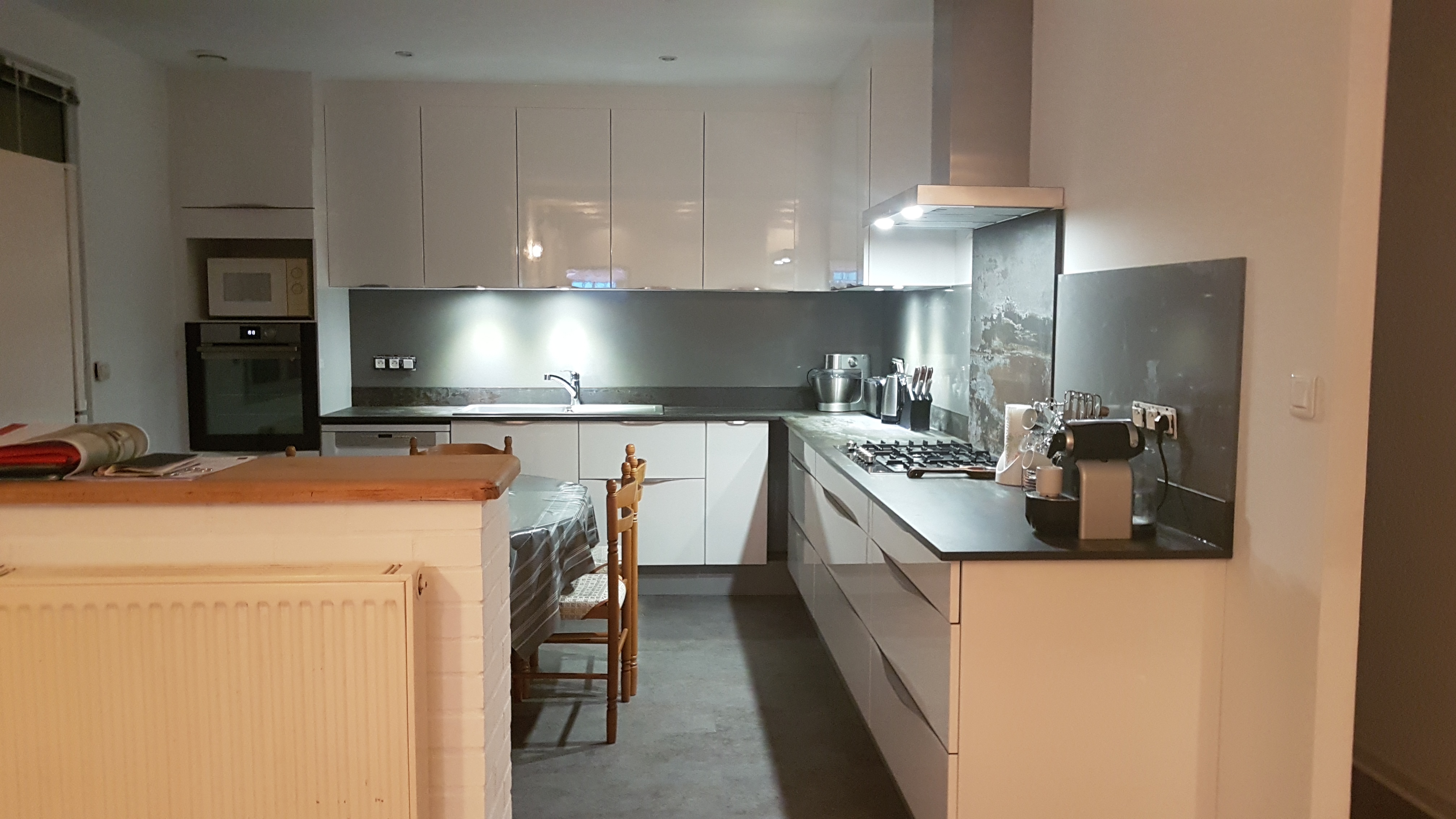 Plan de travail magnifique pourtant pas facile car vieille maison avec des murs pas droit et le plus magnifique est la réalisation de ma table ronde qu'il ma fait sur pied tulipe assortit au plan de travail Merci beaucoup tous nos amis trouve cette cuisine très très classe